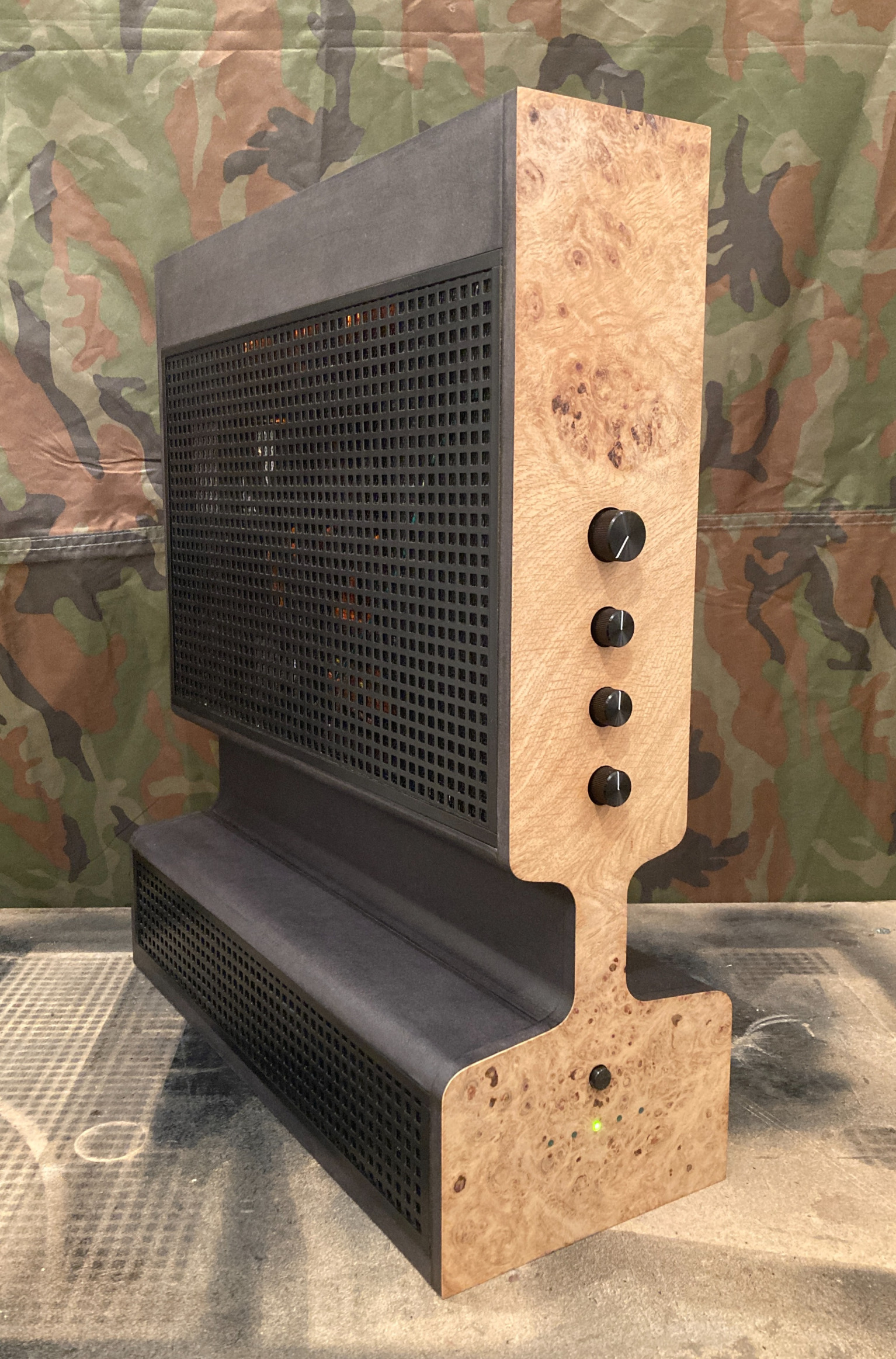 Âme Centrale est destiné à ceux voulant acquérir un appareil à la fois décoratif, puissant et fiable. Les transistors de sortie sont doublés, et cet ampli pilote avec aisance des enceintes de 4 ohms. La conception électrique est robuste. À l'écoute c'est un ampli qui envoie de la puissance. Version 5 grilles et placage loupe de chêne.
